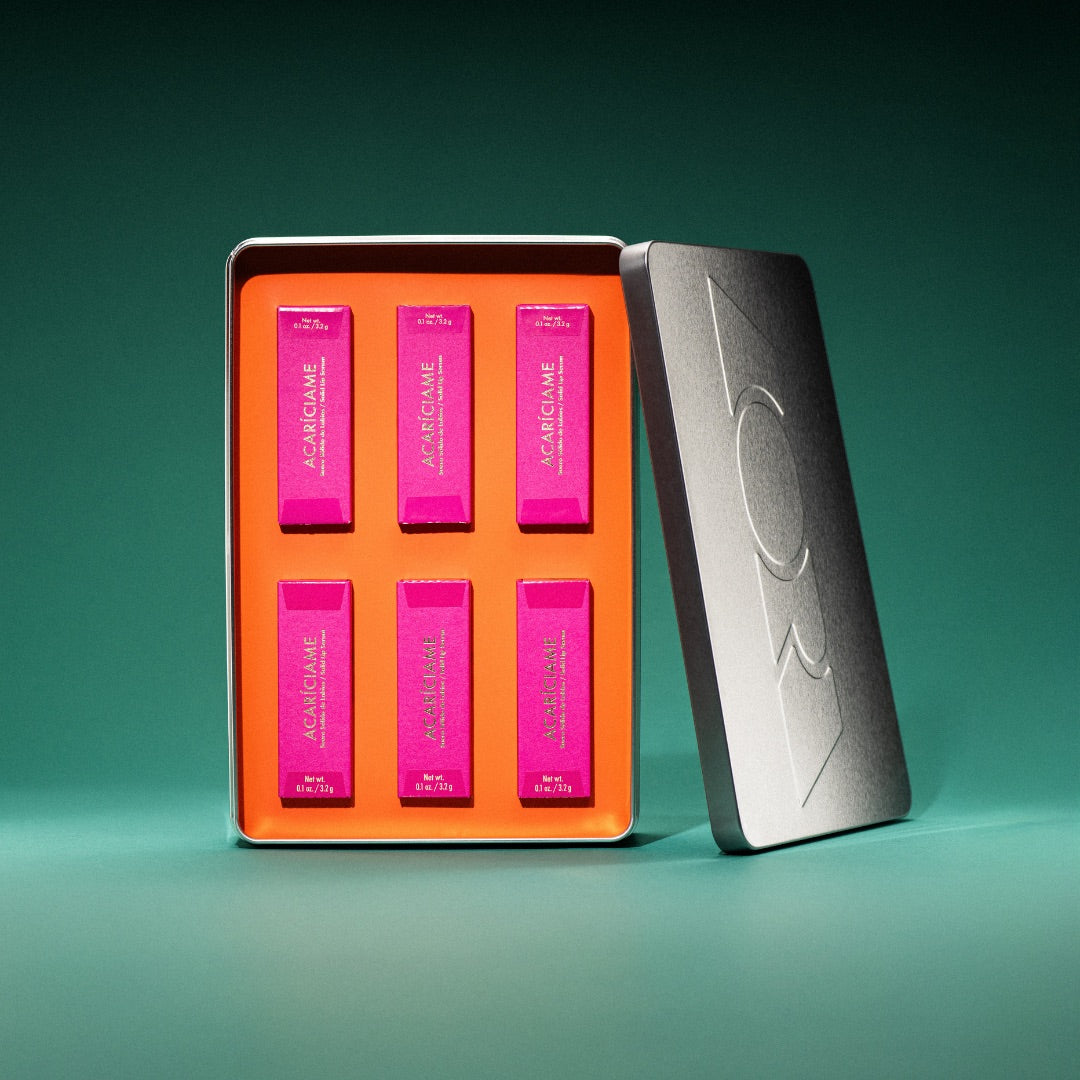 6 tonos del Suero Sólido de Labios Acaríciame se unen dentro de LATA PLATA edición limitada, una lata reutilizable que perdura mucho después de la temporada.